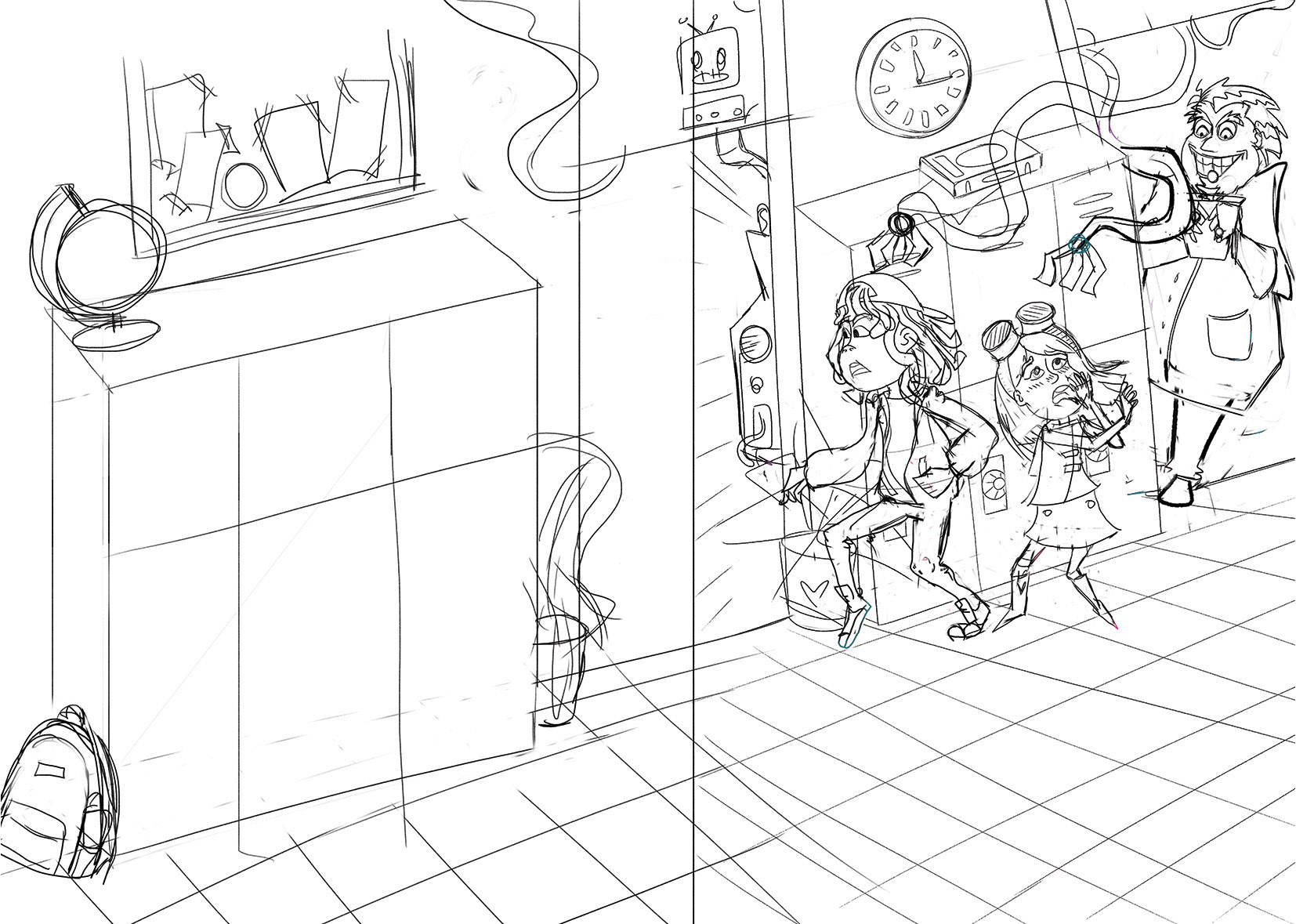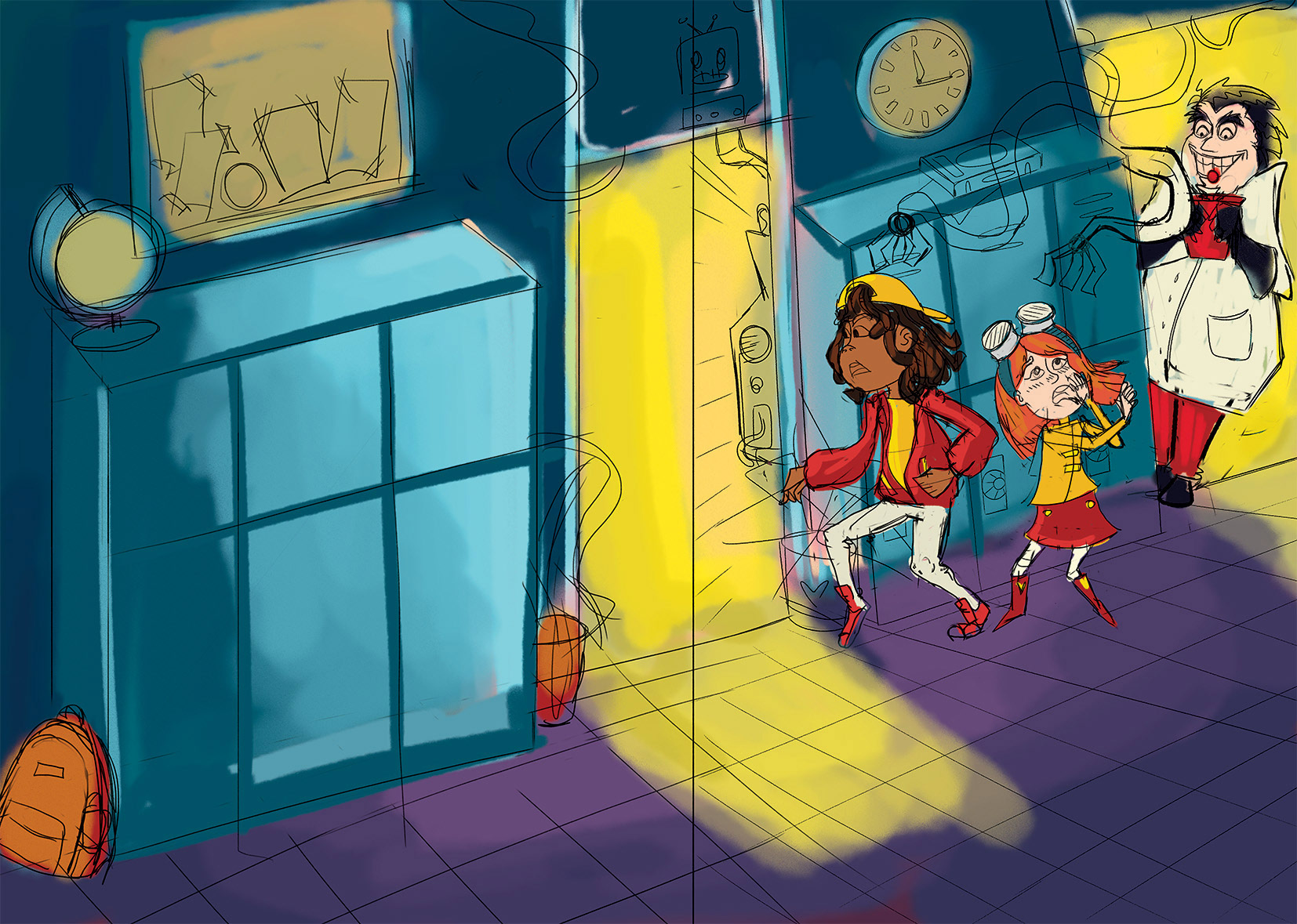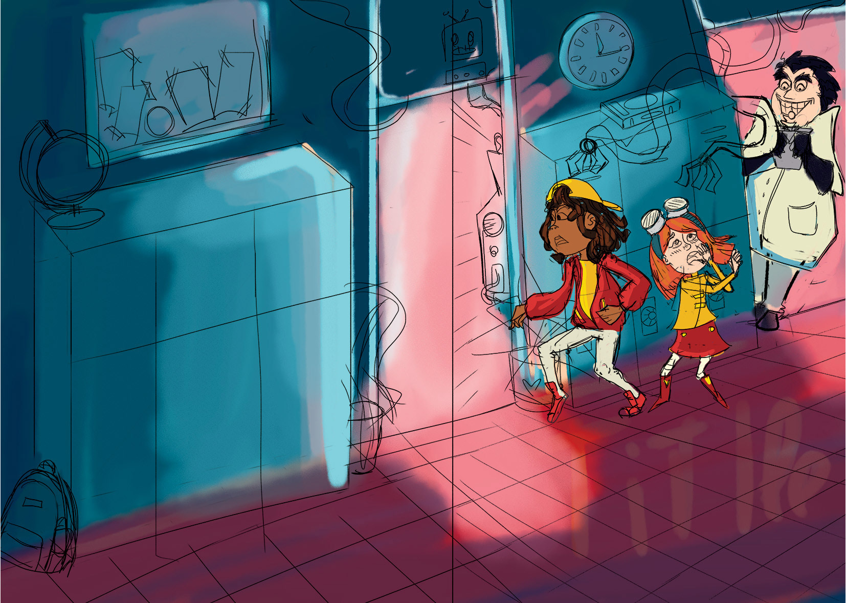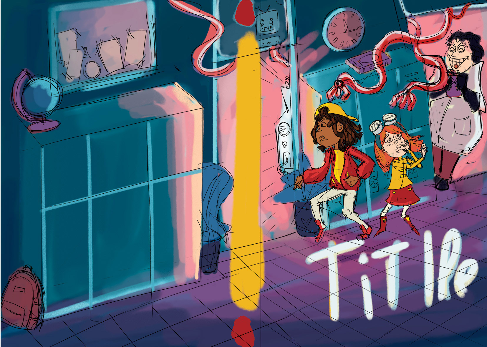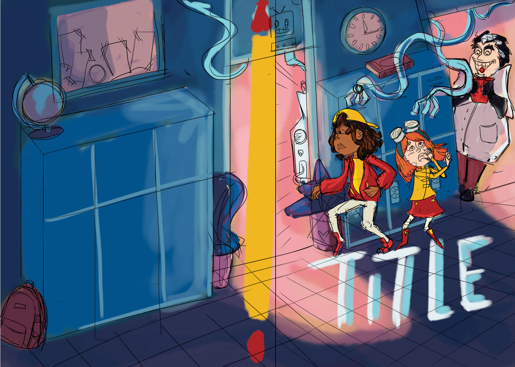 The scene is set at a school at night, where a mad scientist has created a robotic machine. I felt that deep blue tones were a must for this cover. To create an eerie, unsettling atmosphere, I contrasted the blues with cold pinks and greens.