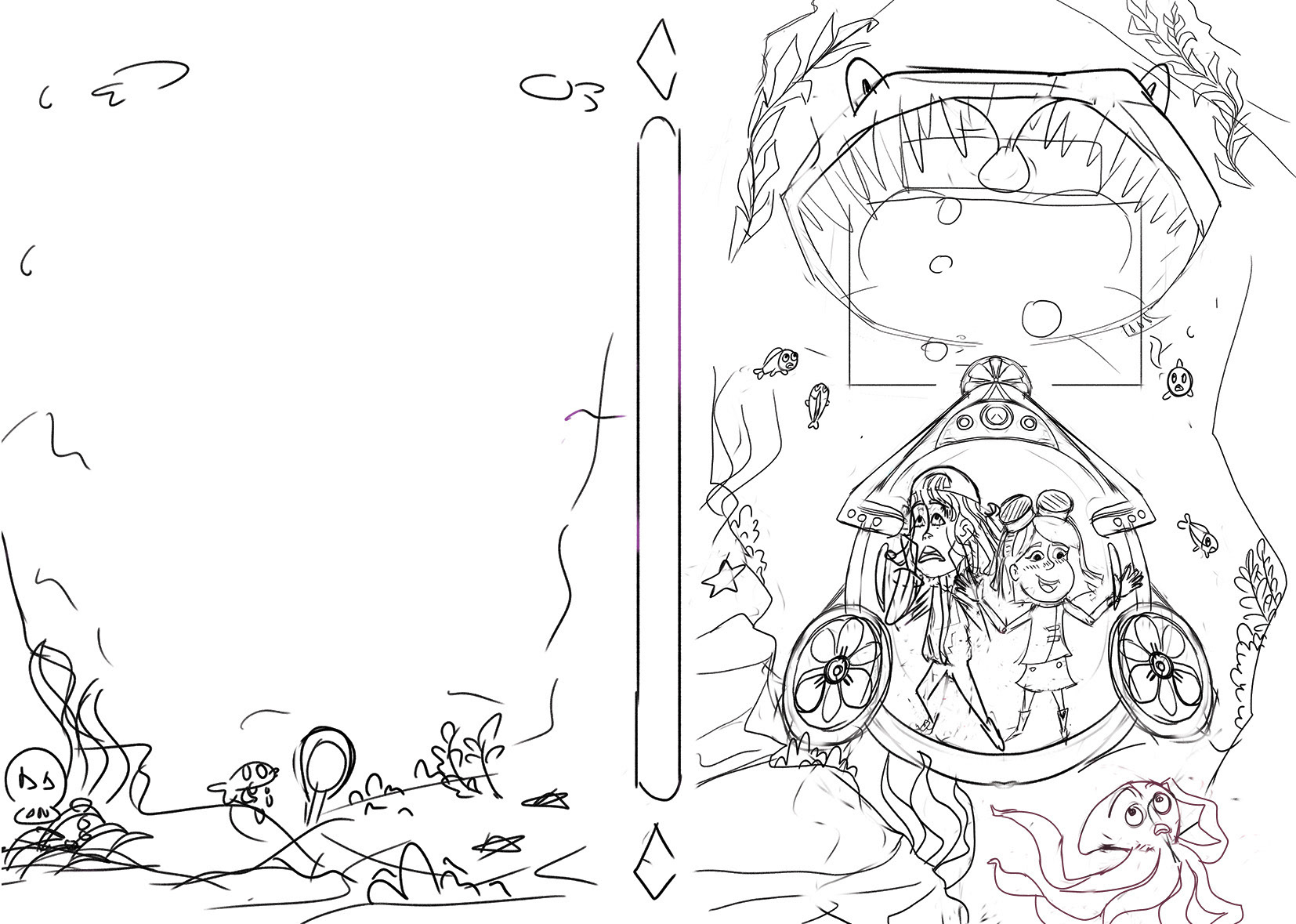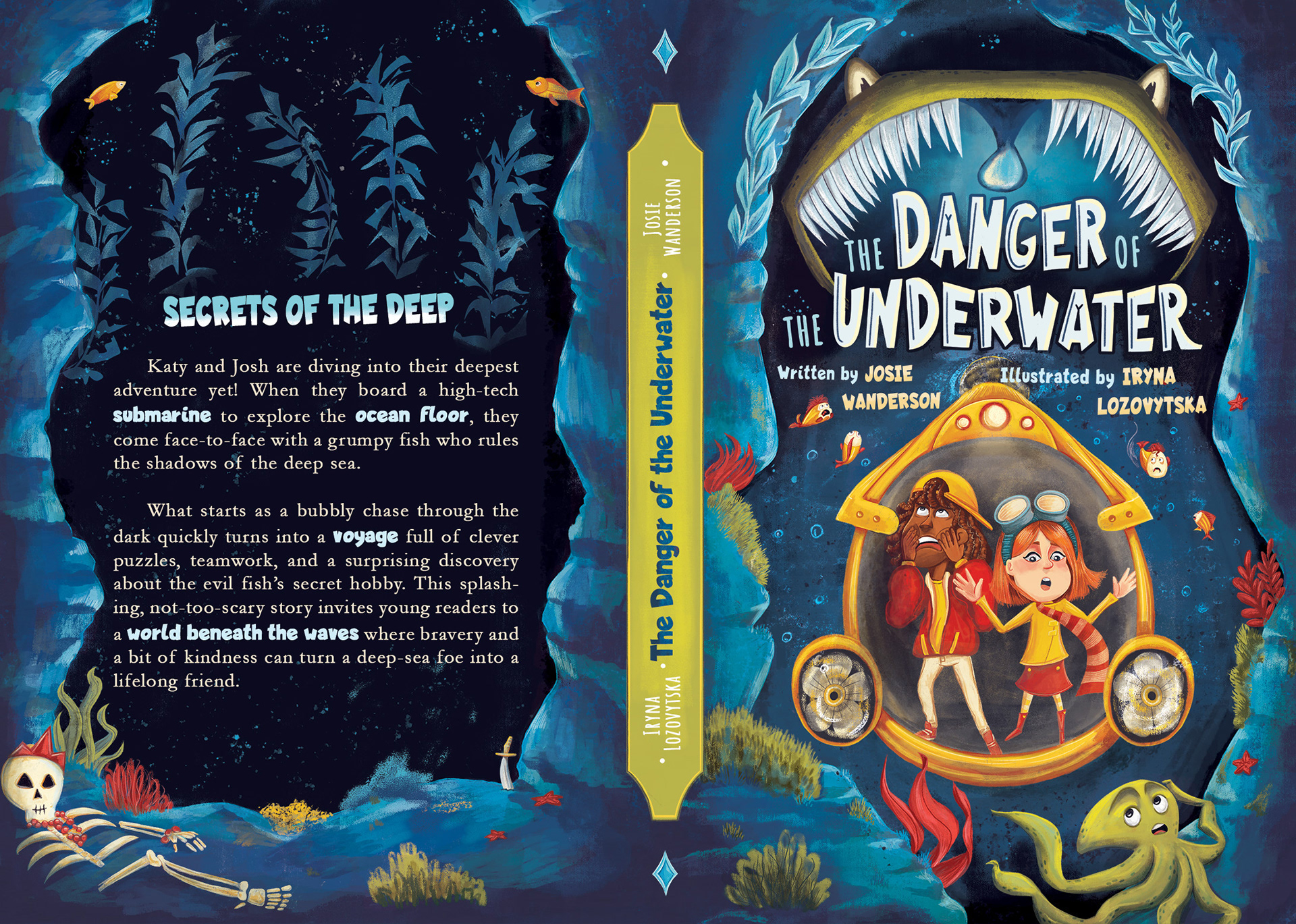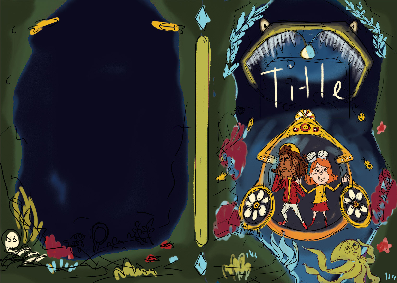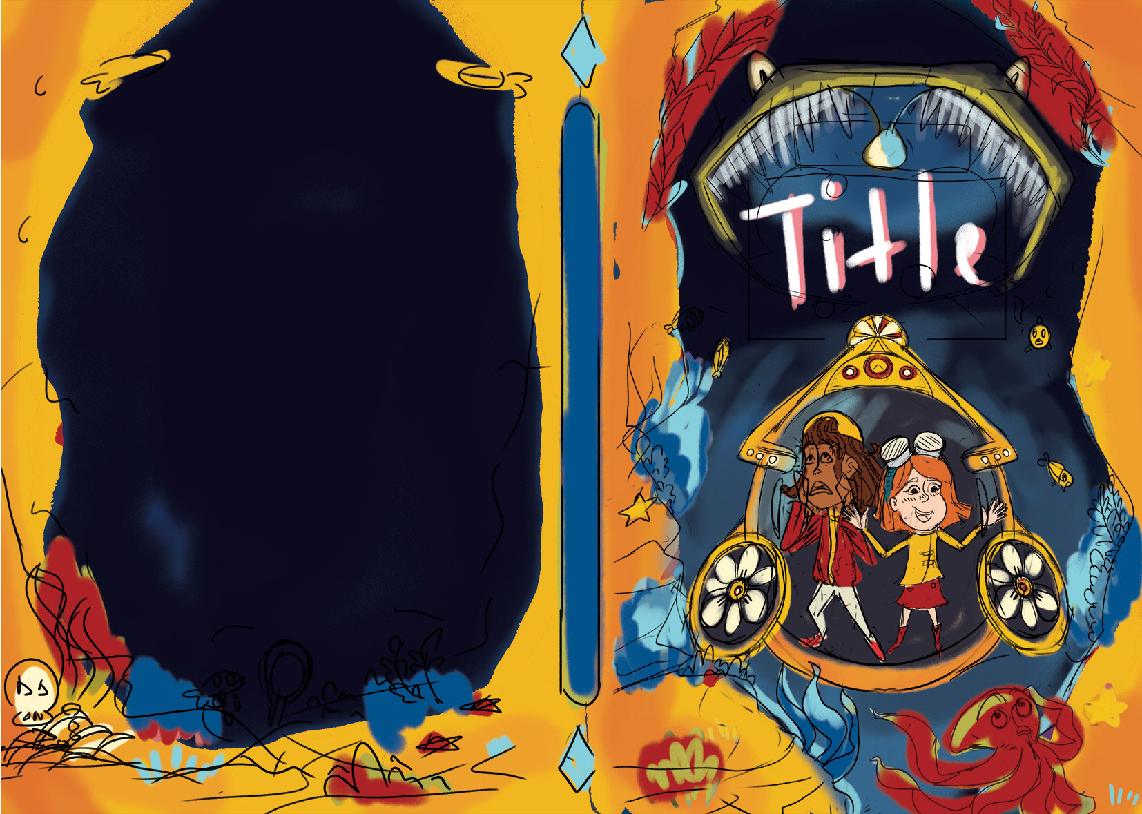 The final book takes place underwater, featuring a monstrous fish as the antagonist. This was quite a challenge. I had to convey the deep sea setting while keeping the palette cohesive with the previous designs. After experimenting with blues, greens, purples, and even yellows, I ultimately decided on a blend of rich blues and navy tones.